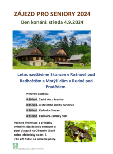 ve středu 4. září 2024 se uskuteční zájezd pro seniory. Navštívíme Skanzen v Rožnově pod Radhoštěm a v Rudné pod Pradědem se podíváme do Motýlího domu. Přihlásit se můžete na Obecním úřadě u paní Vlaszaté osobně nebo telefonicky. Autobus bude přistaven v Zadní Vsi u kravína v 8:10 hod., v Karlovicích u Mateřské školky v 8:15 hod., v Karlovicích u Slezanu v 8:20 hod. a v Karlovicích u Zemského domu v 8:25 hod.