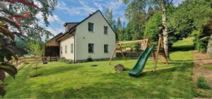 Prostorné a útulné ložnice, plně vybavená kuchyně, dvě koupelny, velká zahrada s grilem, ohniště, finská sauna, venkovní posezení, dětské hřiště, lyžárna a kolárna