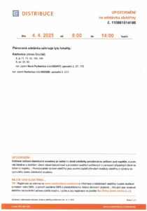 Vážení občané, v pátek 4. dubna 2025 dojde k odstávce elektřiny v čase od 8 do 14 hodin.