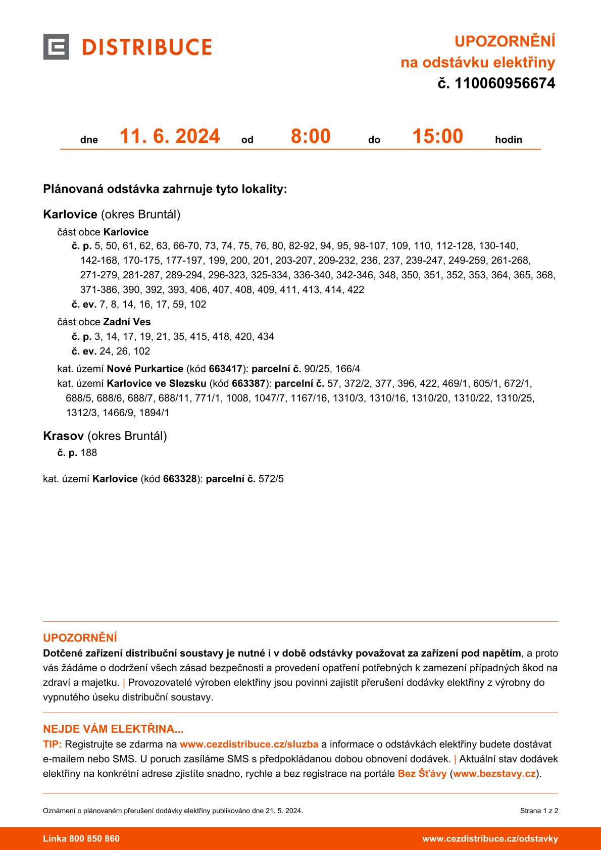 Jste zde: Úvod / Novinky / Plánovaná odstávka elektrické energie