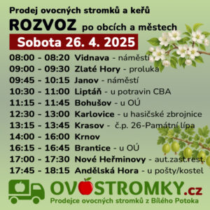 V sobotu 26. dubna v čase od 12:30 do 13:00 hod. bude u hasičské zbrojnice probíhat prodej ovocných stromků a keřů od firmy Ovostromky.cz z Bílého Potoka. K dostání budou jabloně, hrušně, švestky, třešně, borůvky a další. Přijďte si vybrat!