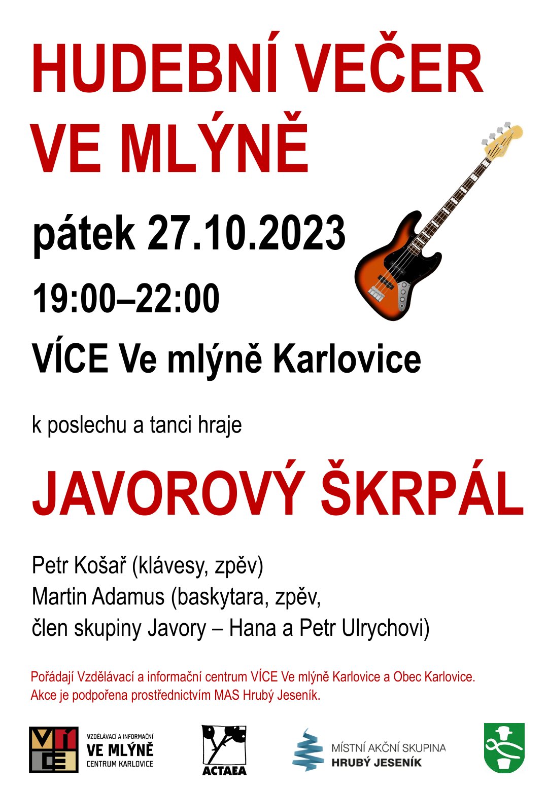 Vzdělávací centrum VÍCE Ve mlýně vás srdečně zve v pátek 27. října 2023 od 14:00 do 18:00 hodin na Drakyádu a dýňování. Od 19 hodin se můžete těšit na hudební večer, zahraje Javorový škrpál.