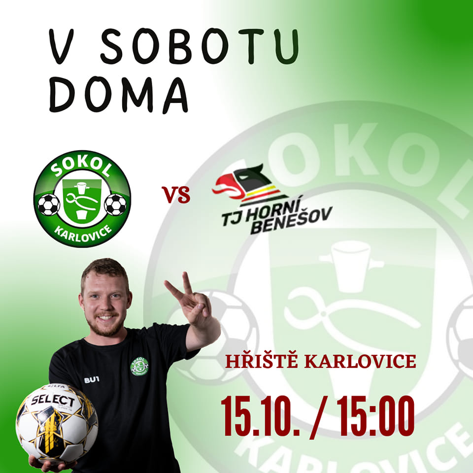 Sokol Karlovice Vás srdečně zve na mistrovské utkání okresního přeboru mužů proti Hornímu Benešovu, které se uskuteční v sobotu 15. 10. 2022 v 15:00 hodin na fotbalovém hřišti. Předzápasem mužů bude utkání starších žáků, kteří přivítají od 12:00 hod. Břidličnou. Občerstvení zajištěno.